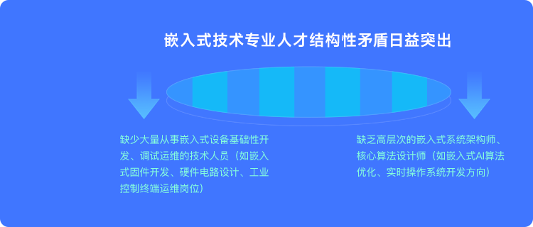 教育部、工业和信息化部、交通部、卫生部联合调查的专业领域人才需求状况表明,随着中国嵌入式技术应用领域规模不断扩大(覆盖工业控制、汽车电子、医疗设备、智能交通等场景),嵌入式技术专业人才结构性矛盾日益突出,人才结构呈两头小、中间大的橄榄型——不仅缺乏高层次的嵌入式系统架构师、核心算法设计师(如嵌入式AI算法优化、实时操作系统开发方向),也缺少大量从事嵌入式设备基础性开发、调试运维的技术人员(如嵌入式固件开发、硬件电路设计、工业控制终端运维岗位)。