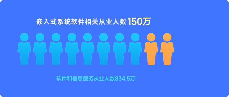 嵌入式技术领域岗位类型较为复杂,既包含核心技术类岗位(如嵌入式系统开发工程师、嵌入式硬件工程师、固件开发工程师、嵌入式测试工程师),也包含技术与业务融合类岗位(如懂工业场景的嵌入式解决方案工程师、适配医疗设备的嵌入式应用开发人员、对接智能交通需求的嵌入式系统集成师)。统计全部人员数量较为困难,根据工业和信息化部2023年发布的软件业经济运行数据,嵌入式系统软件作为软件业核心细分领域,其相关从业人数约占软件和信息服务总从业人数的18%,结合软件和信息服务从业人数834.5万人测算,嵌入式技术相关从业人数超150万人。
